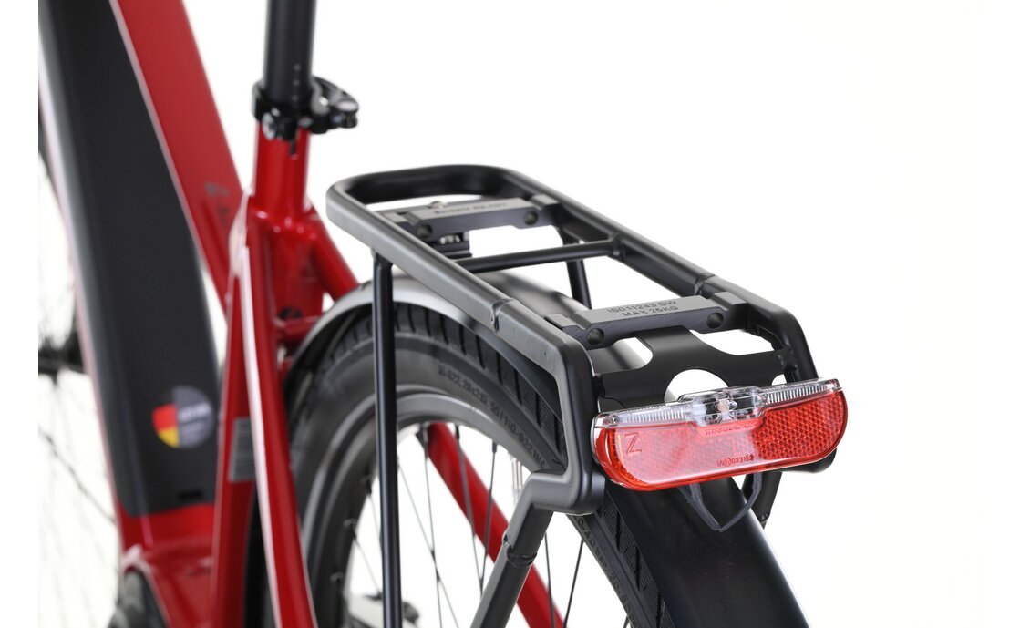 Das Carver Route E.520 wird als vollausgestattetes Sorglos-Paket geliefert. Die Herrmans H-Black MR8 E LED-Frontbeleuchtung sorgt mit ihrer hohen Lichtausbeute für maximale Sicherheit bei Dunkelheit. Der Standwell Gepäckträger mit dem Racktime Snap-it System ermöglicht den sekundenschnellen Transport von Taschen und Körben. Hochwertige SKS Schutzbleche schützen die Kleidung effektiv vor Schmutz, während der stabile Atran REX Seitenständer ein sicheres Abstellen des Rades garantiert. Mit einem zulässigen Gesamtgewicht von 140 kg bietet das Rad enorme Reserven für Fahrerin und Zuladung, was seinen Status als vielseitiger Partner für alle Lebenslagen unterstreicht.