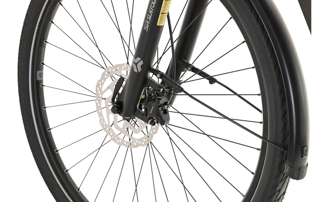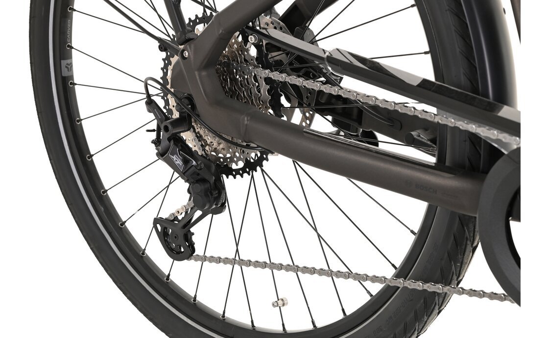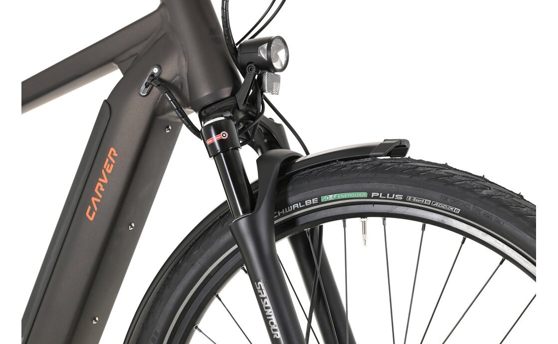 Das E-Bike rollt auf stabilen 28-Zoll-Laufrädern mit Schürmann Yak Disc Hohlkammerfelgen und einer hochwertigen Shimano Hinterradnabe. Den entscheidenden Kontakt zur Fahrbahn stellen die Schwalbe Energizer Plus Reifen in der extra breiten 55-mm-Ausführung her. Diese Bereifung wurde speziell für die Anforderungen schneller E-Bikes entwickelt und verfügt über einen hervorragenden Pannenschutz. Die enorme Reifenbreite fungiert als natürliches Luftpolster, das den Fahrkomfort auf unebenen Straßen massiv erhöht und gleichzeitig für eine hervorragende Fahrstabilität sorgt, was besonders bei hoher Geschwindigkeit für Vertrauen sorgt.