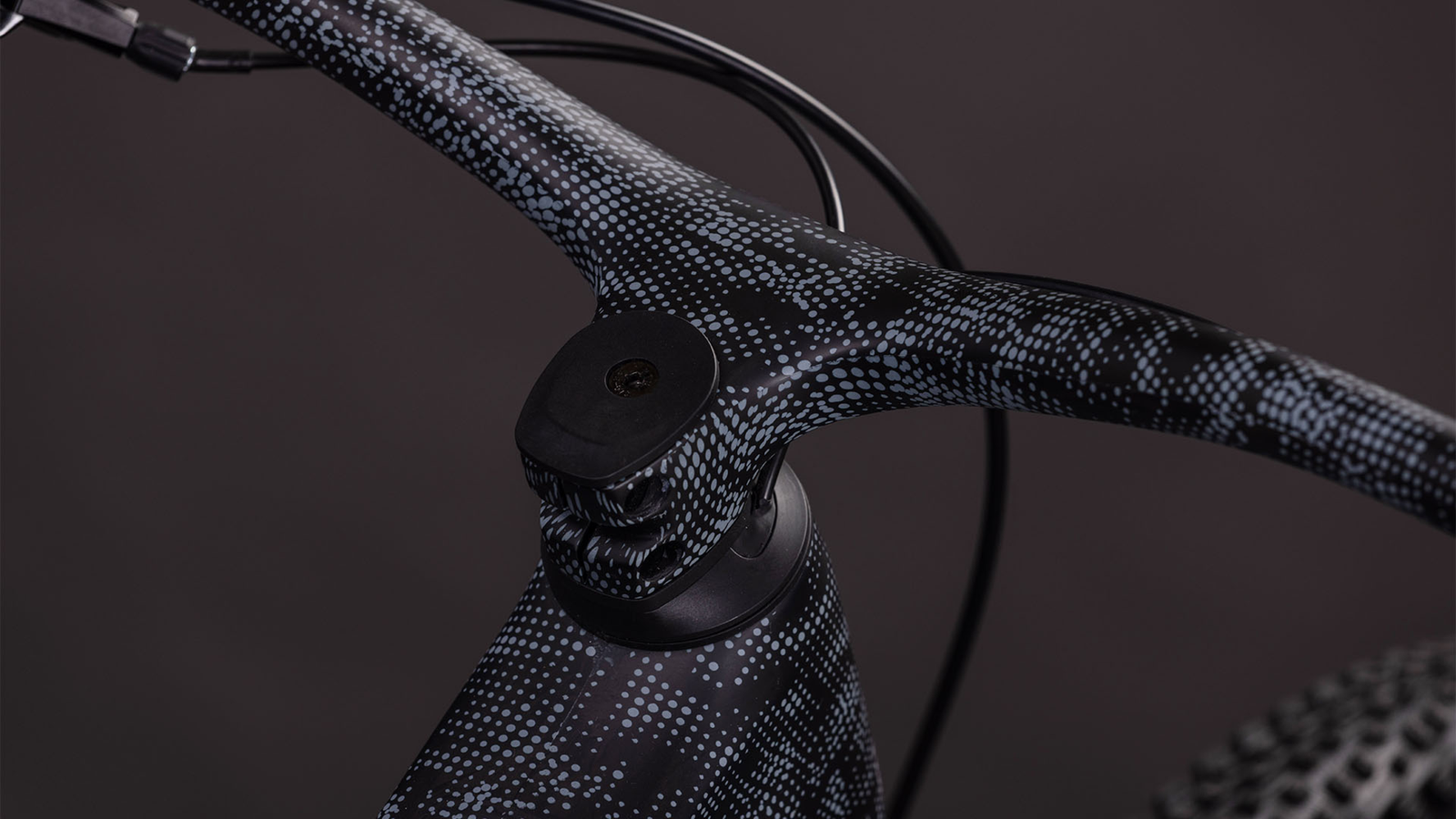 Als Lenker-Vorbau-Einheit kommt das CUBE Stereo Carbon Cockpit System zum Einsatz. Das ist ein weiteres Alleinstellungsmerkmal des AMS: Statt separatem Lenker und Vorbau gibt es eine integrierte Carbon-Einheit, bei der beide Elemente eine gemeinsame Struktur bilden. Das spart Gewicht (keine Klemmung, weniger Material), erhöht die Steifigkeit und vereinfacht das Erscheinungsbild. Kabelführung und Systemintegration sind konsequent weitergedacht.