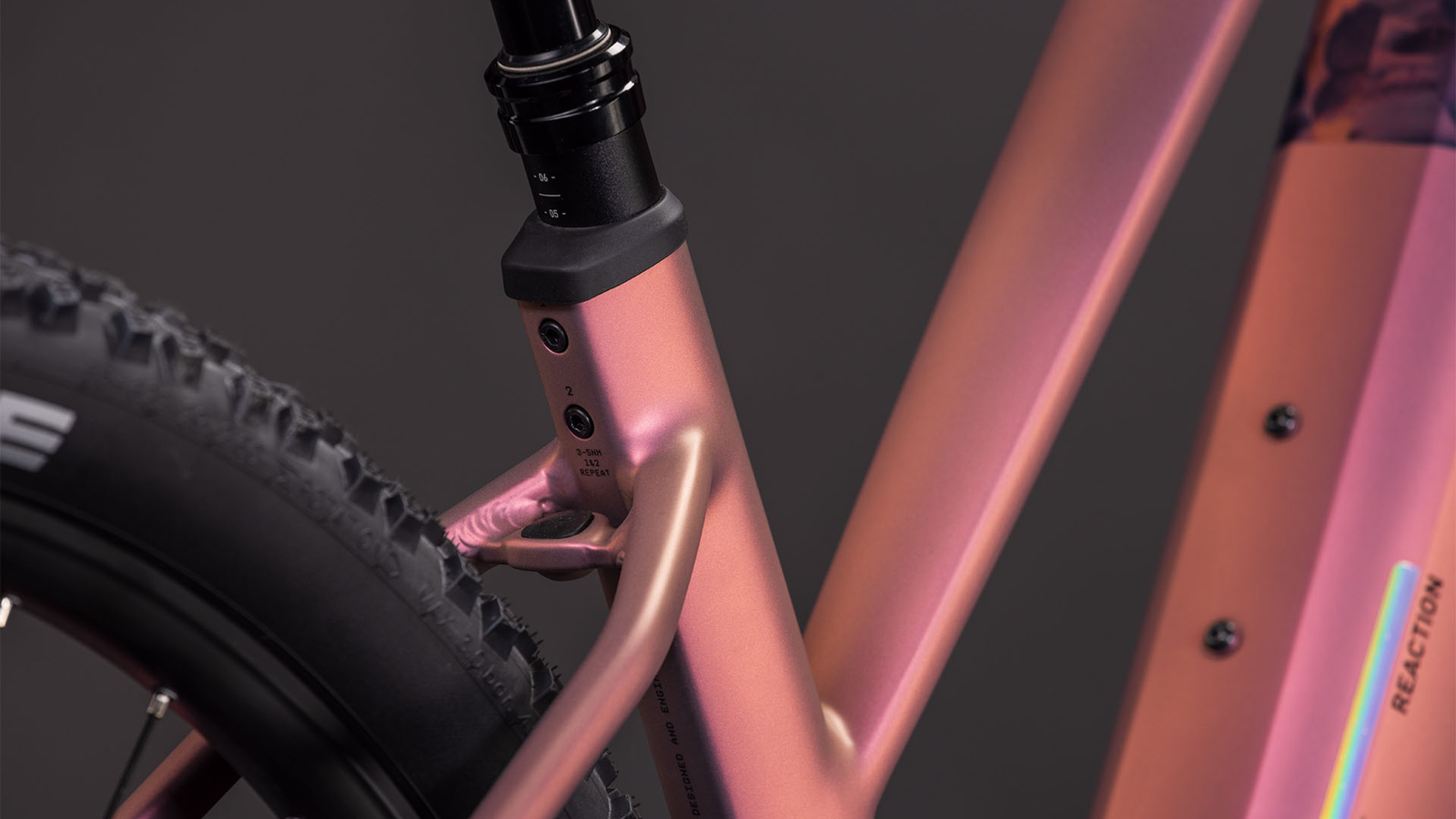 Das Cube Reaction Hybrid SLX 800 shiftblush’n’art ist kein FE-Modell. Schutzbleche, Gepäckträger und Beleuchtung sind nicht serienmäßig verbaut. Der Rahmen bietet Befestigungspunkte für Schutzbleche, Gepäckträger und Seitenständer sowie das X-Connect-Interface im Steuersatz für die einfache Nachrüstung eines ACID-Scheinwerfers. Wer das Rad auch im Alltag nutzen möchte, kann es nachrüsten – ohne Kompromisse am Rahmendesign.