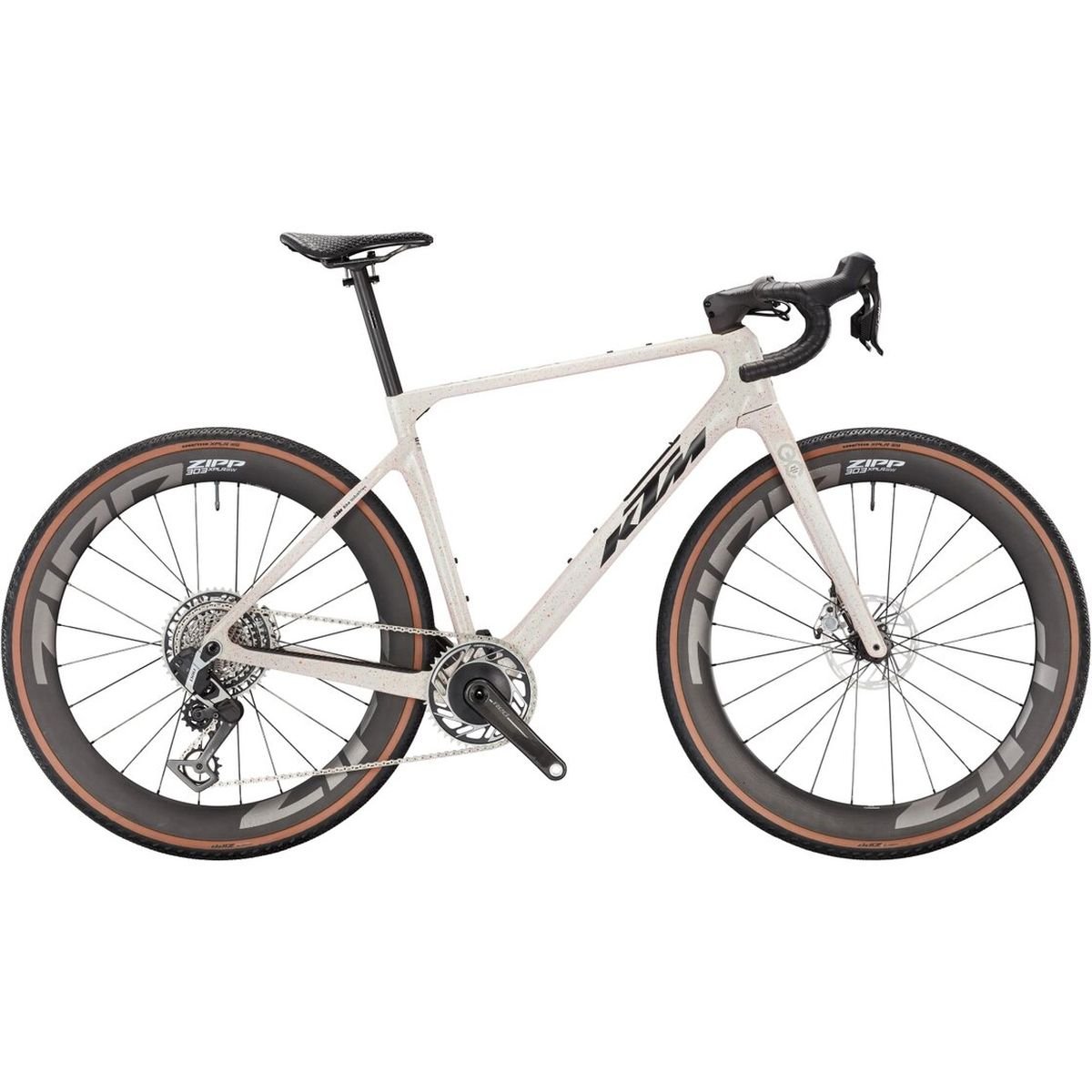 Die Schaltgruppe des KTM Gravelator Exonic wurde nach dem Prinzip ausgewählt, das KTM bei Topmodellen immer verfolgt: nicht das populärste System, sondern das passendste. Auf langen Gravel-Strecken, bei wechselnden Steigungen und unter variablen Bedingungen zeigt die Gruppe, was Präzision bedeutet – ein Gangwechsel, der immer funktioniert, auch wenn die Kette staubig ist, auch wenn die Hände zittern und auch nach fünf Stunden auf dem Sattel. Der Fahrkomfort entsteht dabei nicht trotz der sportlichen Auslegung, sondern durch sie: Ein Rahmen, der Energie effizient weiterleitet, belastet den Körper weniger als einer, der es nicht tut. Das KTM Gravelator Exonic ermüdet nicht – es trägt.