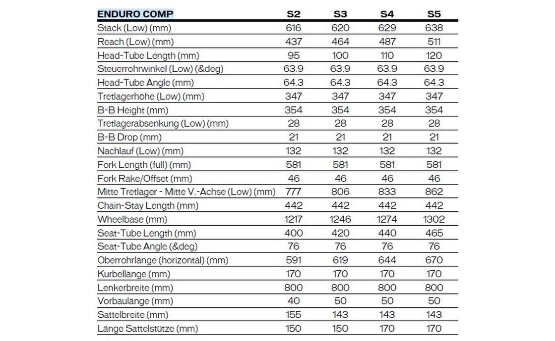 Die Geometrie des Specialized Enduro Comp ist die aggressivste, die Specialized je in einem Serienmodell dieser Klasse angeboten hat – und sie ist der deutlichste Beweis, dass Specialized beim Enduro keine halben Sachen macht. Ein Lenkwinkel von 63 Grad – einer der flachsten in der Industrie – gibt dem Rad eine Stabilität bei hohen Geschwindigkeiten, die auf den steilsten, schnellsten Abfahrten des Enduro-Sports das Vertrauen erzeugt, das mutigeres, schnelleres und freudvolleres Fahren ermöglicht. Ein sehr großzügiger Reach gibt dem Fahrer die Plattform für eine aktive, kontrollierte Fahrposition auch in den technischsten Momenten des Trails. Das tiefe Tretlager – eines der tiefsten in der Klasse – senkt den Schwerpunkt auf ein Niveau, das dem Specialized Enduro Comp eine Bodenhaftung und Stabilität verleiht, die andere Enduro-Räder nicht erreichen.